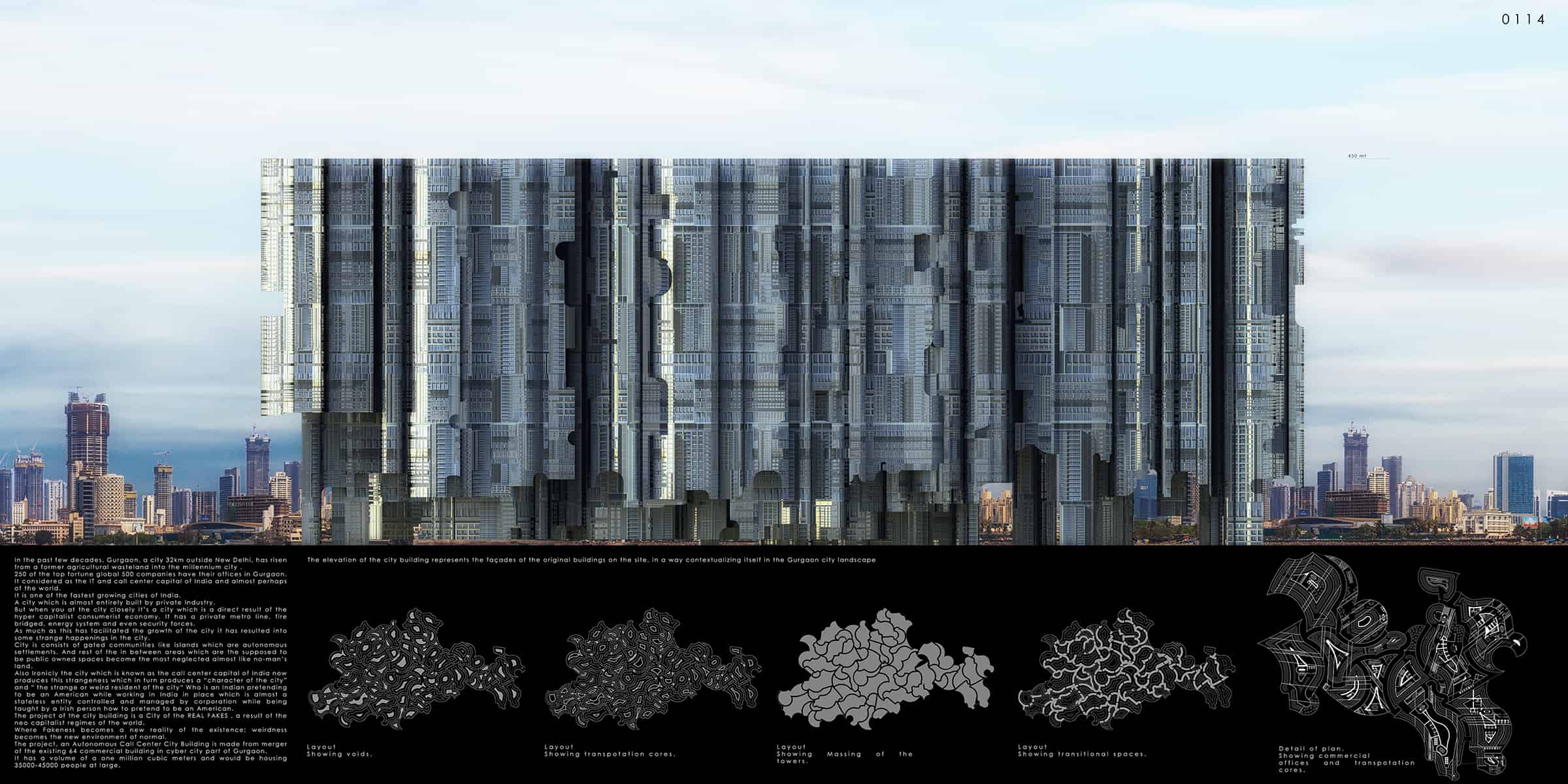 The project is made from merger of the existing 64 commercial building in cyber city part of Gurgaon. It has a volume of a one million cubic meters. And would be housing 35000-45000 people at large.
