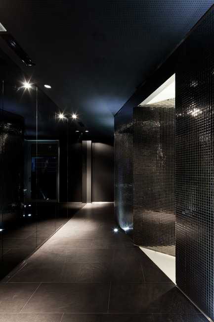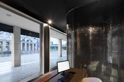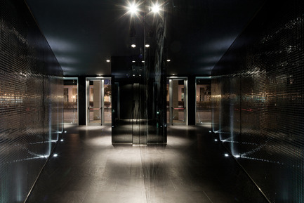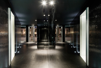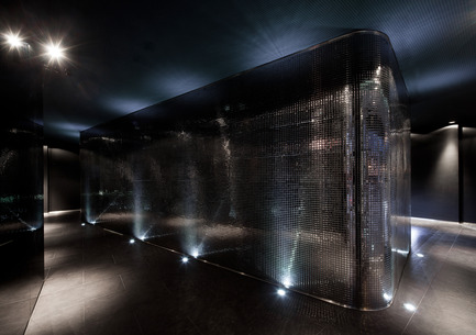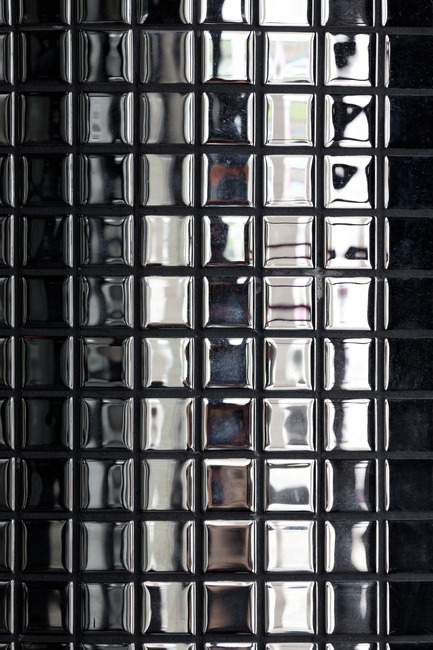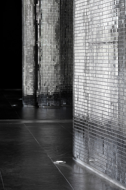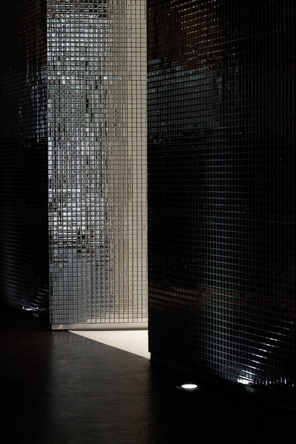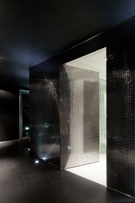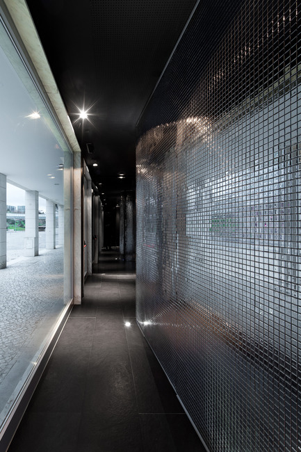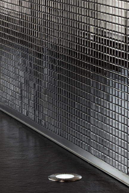 To reinforce the duality between the two spaces, the outside of the organic volume is clad with mirrored mosaics that generate a multitude of light reflections framed by a dark background, that results in a unexpected and sophisticated environment. Although this space holds several adjacent uses like reception, assistance, waiting area and circulation, it’s perceived as a whole.