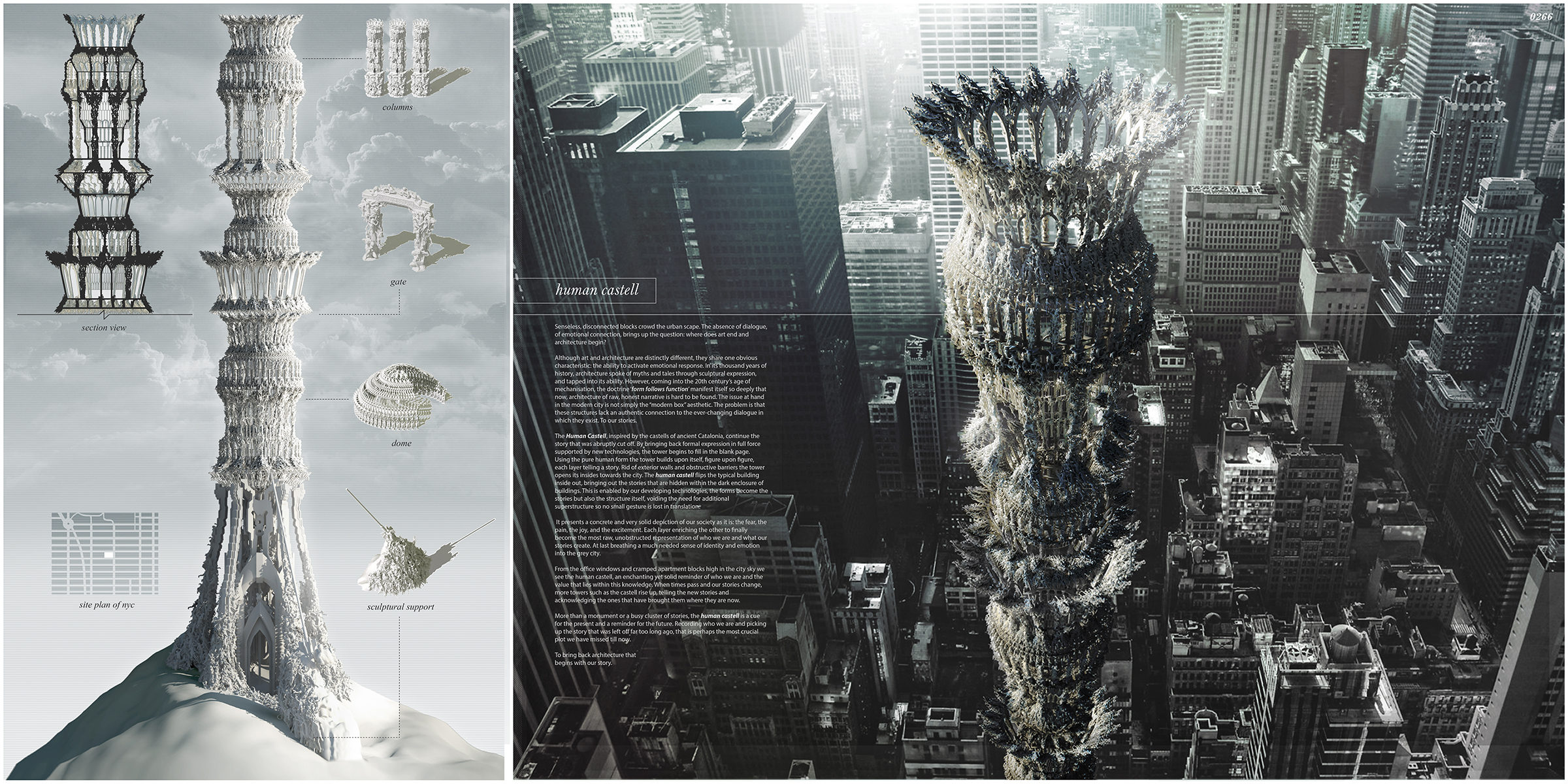 Using the pure human form the tower builds upon itself, figure upon figure, each layer telling a story. Rid of exterior walls and obstructive barriers the tower opens its insides towards the city. The human castell flips the typical building inside out, bringing out the stories that are hidden within the dark enclosure of buildings. This is enabled by our developing technologies, the forms become the stories but also the structure itself, voiding the need for additional superstructure so no small gesture is lost in translation.