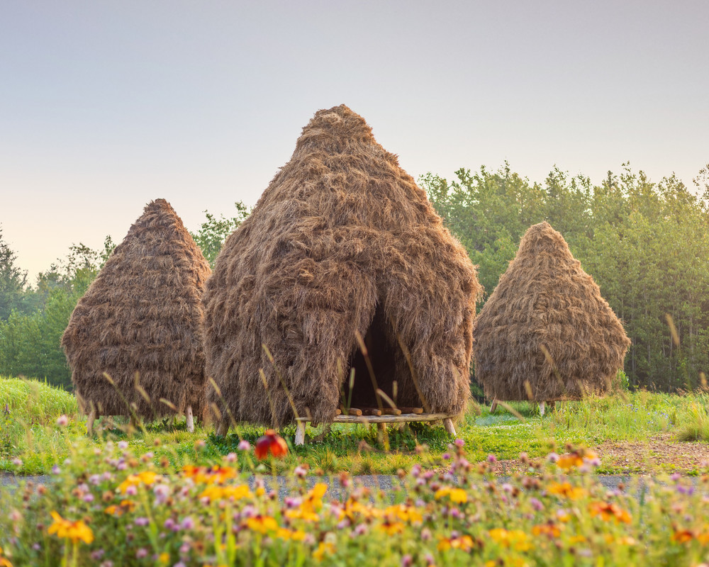 You can see them from afar, unknown, yet familiar creatures standing in the field – seemingly waiting. They catch sunlight and emits a warm golden glow. The wind makes them move slightly. You see them in a constellation, grouped together, but never too close to each other. They are the same kind, but each and every one of them have their unique shape and expression. A piece of nature that has been transformed into something living. When you get close enough, you can see that the creatures are made up of millions of individual objects, straws of hay. Moving closer, you can feel the distinct smell and you can touch both the sharp and soft flesh of the structures. And then you crawl inside. The covid-19 pandemic has taught us a lot. It has exposed a disconnection from nature, agriculture and the importance of biodiversity. All around the globe, a regained interest in traditional, sustainable ways of inhabiting the earth is emerging. Hässja is an installation based on one of these nearly lost arts of working the soil – hay-drying structures. The three structures, made out of the very plants surrounding them, are not only educational, they are formed and arranged in a way that enhances their inherited visceral qualities. Unlike normal hay-drying structures, these have an interior room. The small space inside each provides a refuge from the world of today, and provides for reflection on man’s relation to nature, to past and future ways of inhabiting our land.