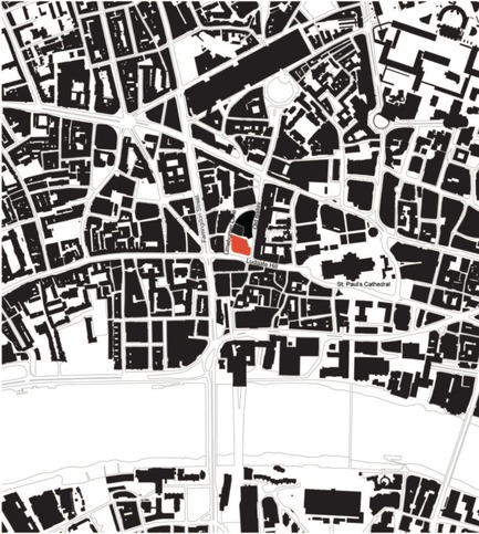 Around the site, street lines, grades and views are repaired and improved, such as the processional route to the western entrance of St Paul’s.