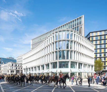 White precast concrete frames, simply detailed, respect their neighbours and set off the floor-to-ceiling low-ion glazing, while vivid amber ‘Kathedral’ glass fins are used on the piazzetta ‘accent’ façade in the new public space, where a mature tree provides shade and visual link for Belle Sauvage. A floating plane of photovoltaic cells lines the roofscape along with plant and a green roof, while both buildings flank a still-operating two and a half-storey city electrical interchange, which allows light into the heart of the site.Â