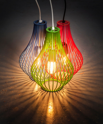 The collection items are a delicate design of luscious curved wires into elegant see through pendants and wall lamps, unique and suitable for home, office and commercial spaces.All collection items are handmade, silver soldered and powder coatpaint finished, available in a 5 color selection: Green, Red, Blue, Blackand White.